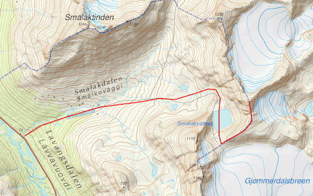 Det er ruten, som jeg tok i dag. I alt ca. 6 km distanse en vei og 1150 hm stigning. Brukte 4:15 timer i dag. Ruten langs hø. sida av elva i Smalakdaken er lettgått og det er hogd sti, slik at man slipper kratt. Før man kommer til Smalakvatnet er det et bratt heng med ca. 30-35 grader på 100 hm, som kan være rasutsatt. Veien videre er relativt enkel, i hvert fall til skidepot på 1050-1100 moh. Derfra anbefales stegjern og isøks, de siste rundt 150 hm er det tinderangling langs en luftig egg med en rekke bratte oppsving.....Den beskrevne muligheten er langt fra den eneste for å komme seg på denne toppen. Via breen på nord er toppen lettere tilgjengelig enn fra sør, men til gjengjeld på du regne med mye mer anmarsj....